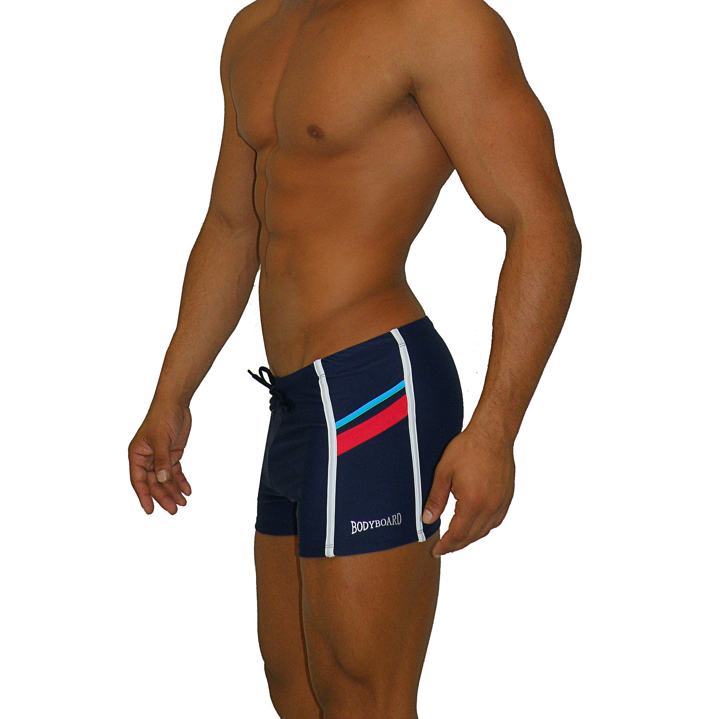 BERMUDA DE TRES COLORES CON COSTURA ZIGZAG, LOGOS BORDADOS, BOLSILLOS LATERALES Y TRASERO.